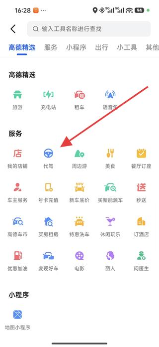 1、進入軟件服務頁面,瀏覽旅游、充電站、租車等高德精選功能及我的店鋪、代駕、周邊游等服務選項,點擊代駕,進入高德代駕頁面。