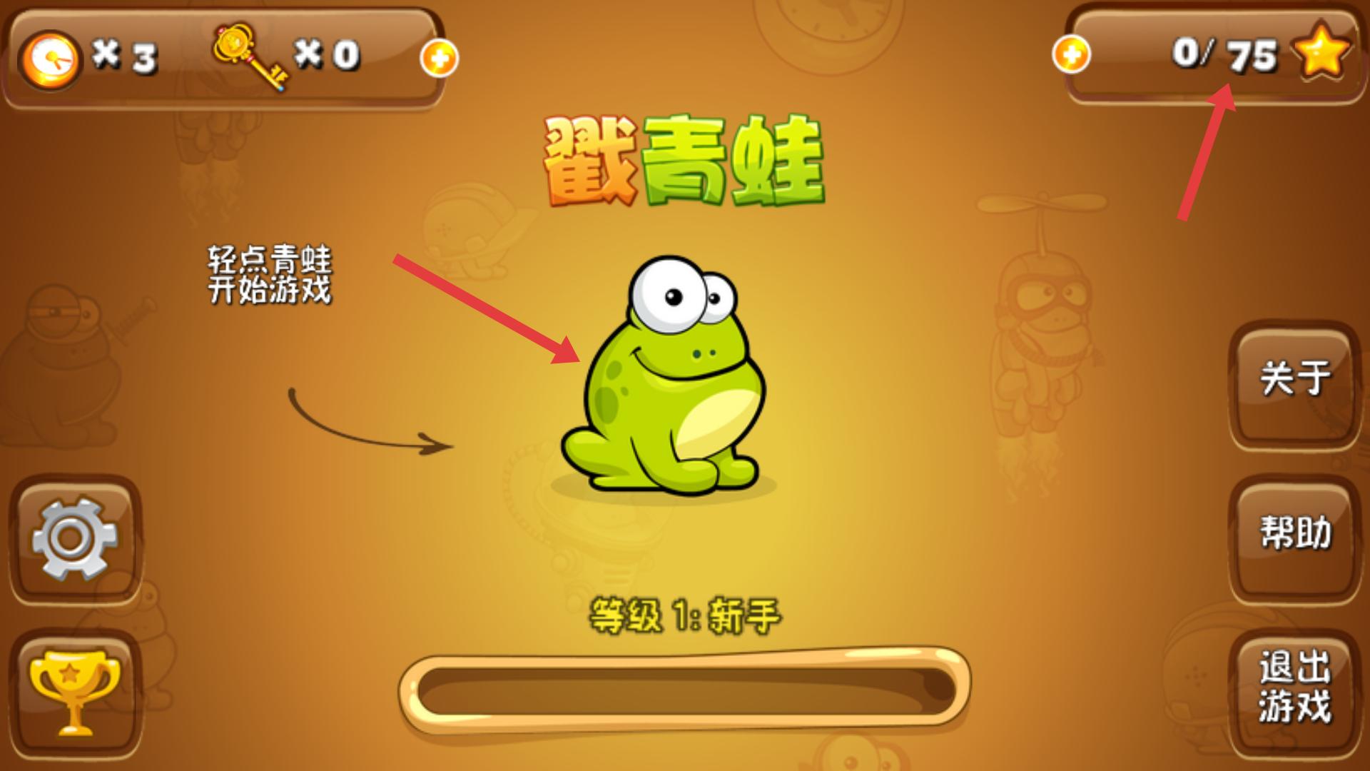 1、游戲初始界面有只綠色青蛙,輕點青蛙就能開始游戲,目標是積累星星,達到75顆星星可推進游戲進程,開啟后續(xù)挑戰(zhàn)。