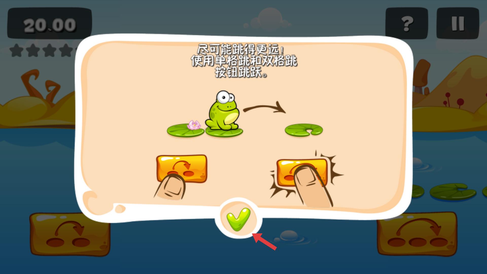 2、進入游戲會有操作提示,要盡可能讓青蛙跳得更遠,利用單格跳和雙格跳按鈕來控制青蛙跳躍,點擊綠色對勾可確認提示并開始游戲。
