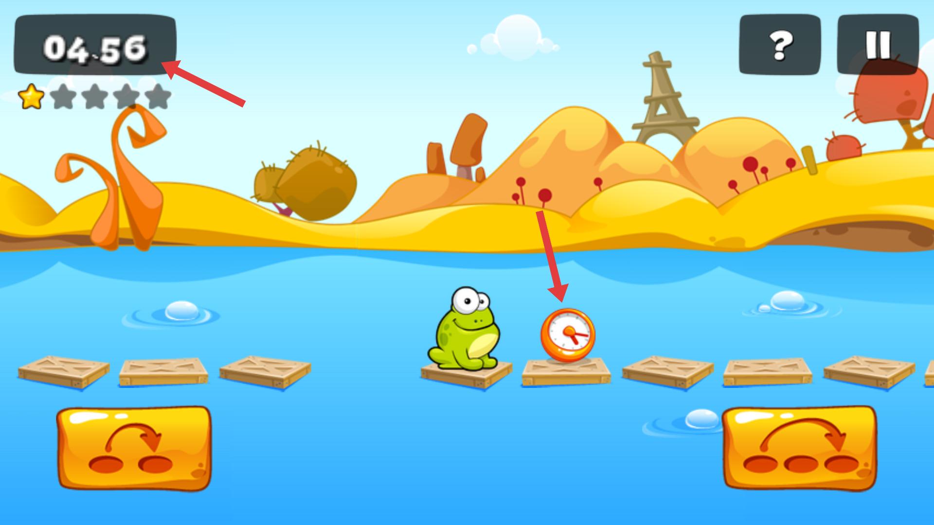 3、左上角有計時,要關(guān)注時間,同時青蛙旁有時鐘道具,獲取它能延長時間,幫助青蛙在規(guī)定時間內(nèi)跳得更遠,積累分數(shù)和星星。