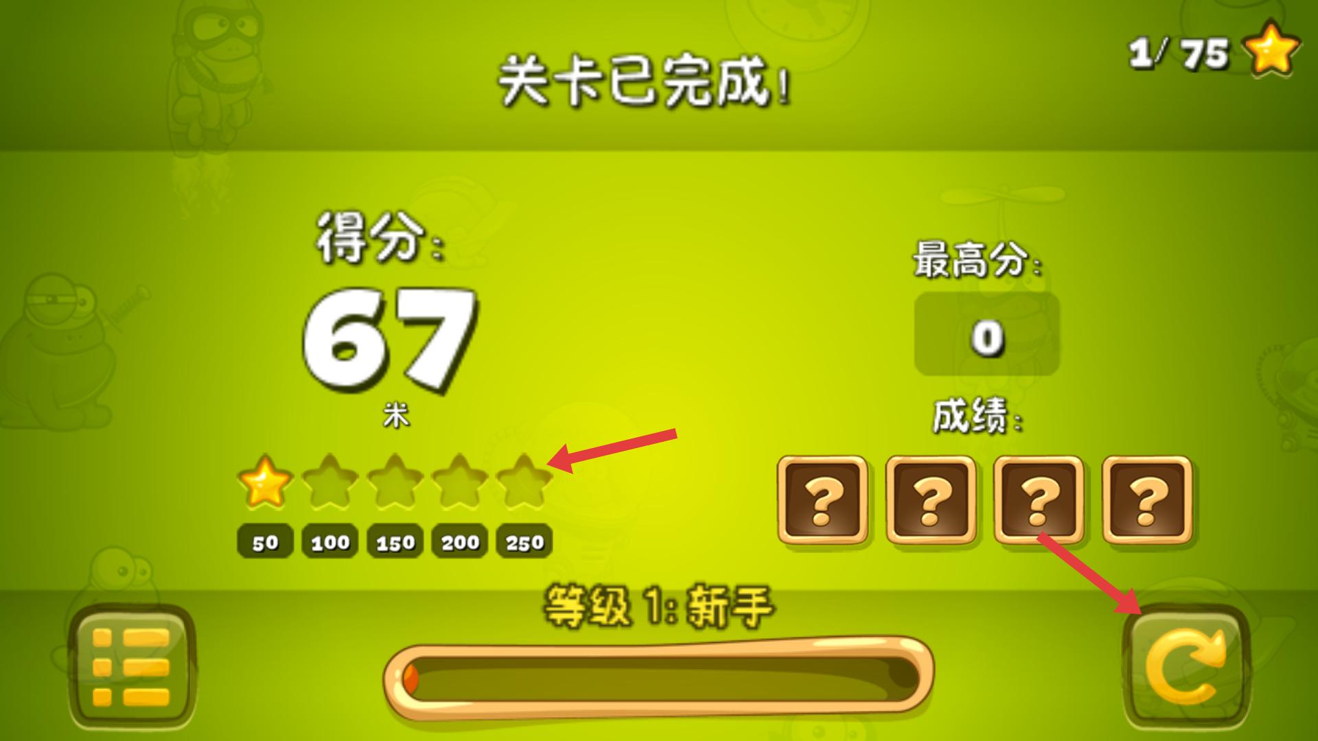 4、關(guān)卡完成后,界面顯示得分、星星數(shù)等,若想挑戰(zhàn)更高分數(shù),可點擊右下角刷新按鈕重新開始本關(guān)卡,爭取獲得更好成績,積累更多星星。
