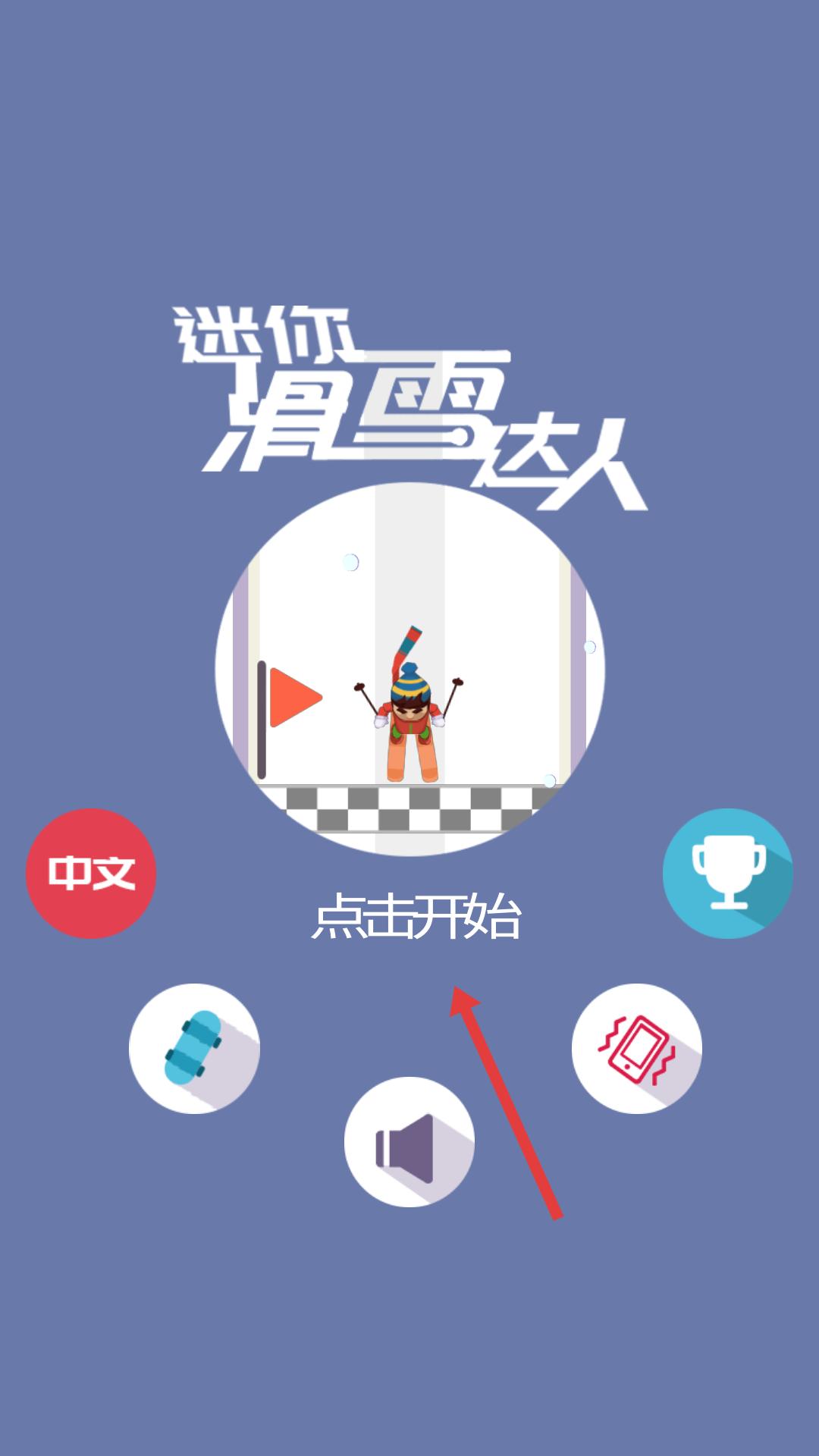 1、游戲初始界面有點(diǎn)擊開始字樣,點(diǎn)擊該區(qū)域,可進(jìn)入游戲,開啟迷你滑雪達(dá)人的滑雪冒險(xiǎn)之旅,體驗(yàn)滑雪樂趣。
