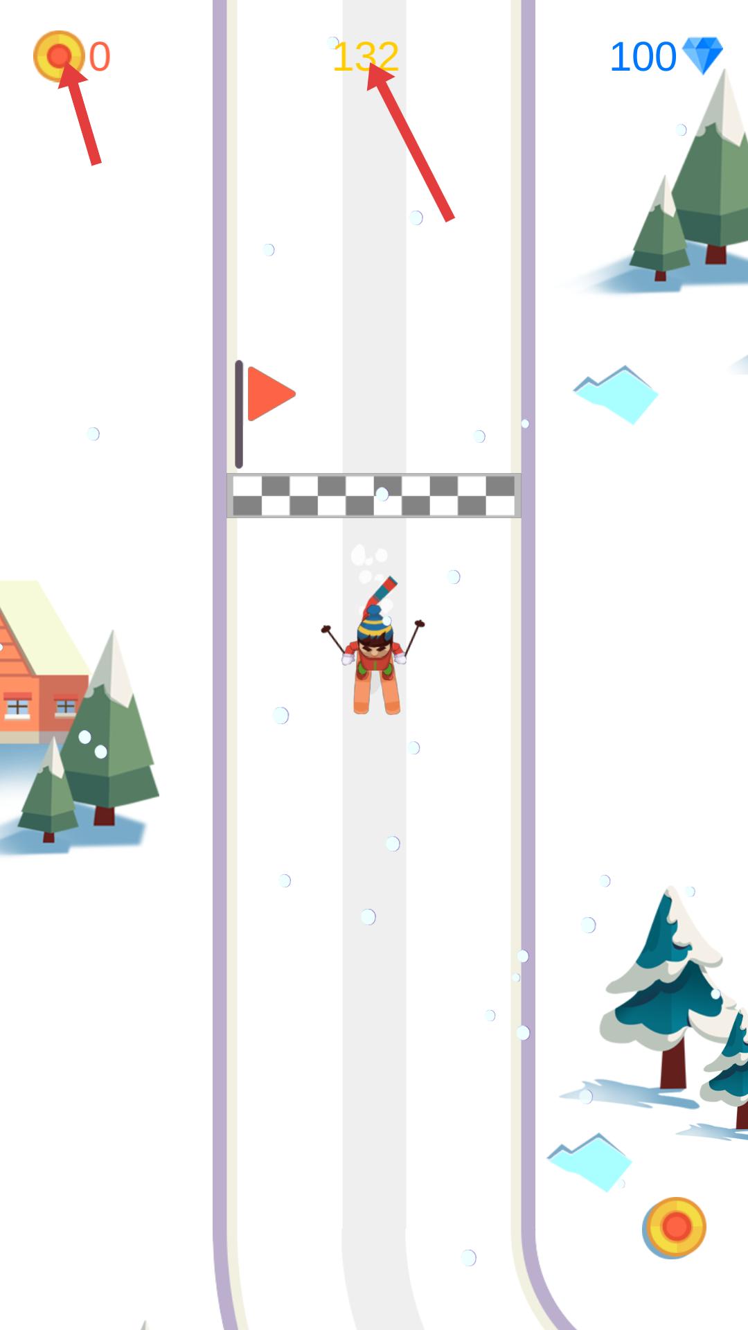 2、進(jìn)入游戲后,操控角色在雪道滑行,要關(guān)注得分變化,延長(zhǎng)滑行距離,積累分?jǐn)?shù),提升游戲成果,感受滑雪的刺激與挑戰(zhàn)。