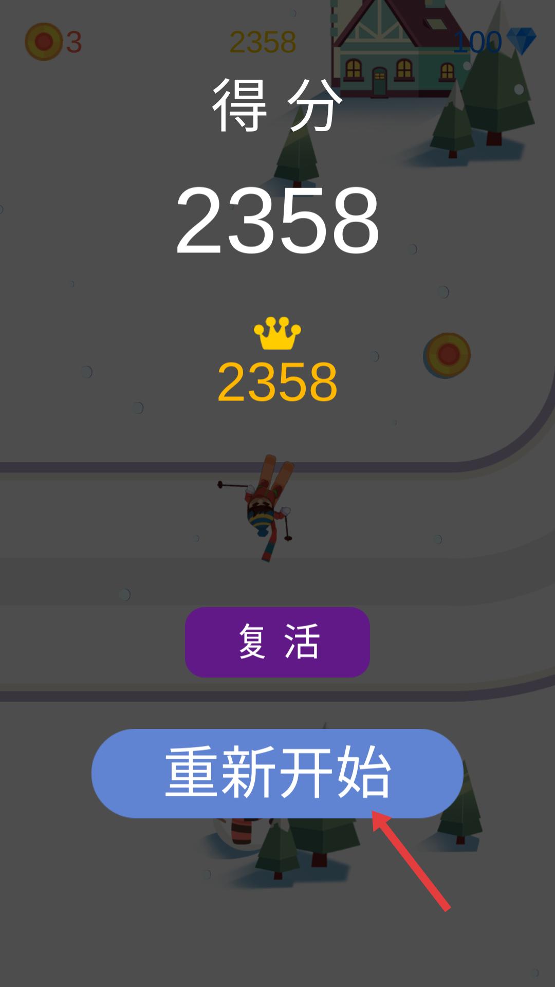 4、游戲結(jié)束后,界面顯示得分等信息,若想重新挑戰(zhàn),可點(diǎn)擊重新開始按鈕,再次進(jìn)入游戲,嘗試獲得更高分?jǐn)?shù),提升滑雪技巧。