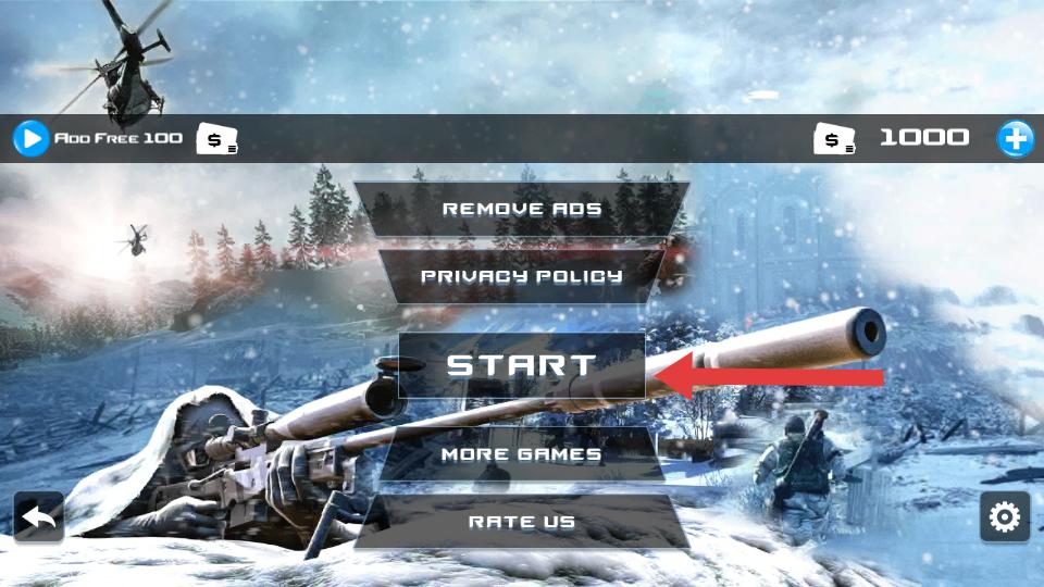 1、進(jìn)入游戲,點(diǎn)擊START,就能開啟雪地狙擊任務(wù),準(zhǔn)備到雪地場(chǎng)景中執(zhí)行狙擊任務(wù)。