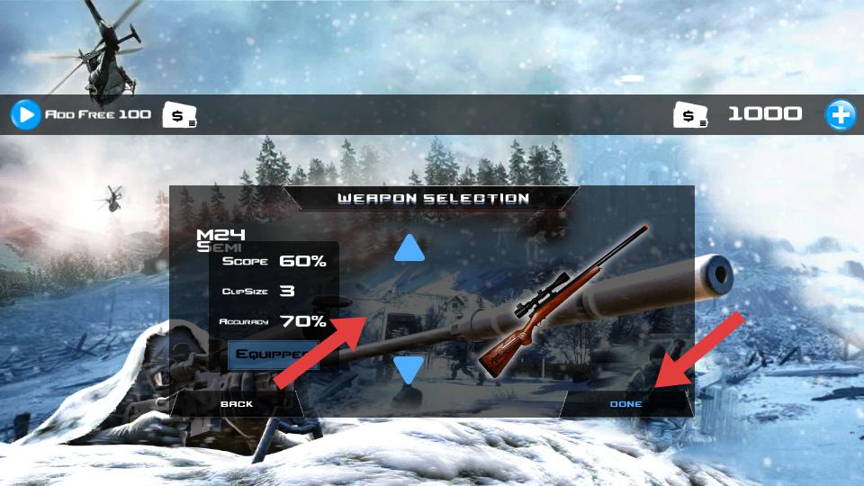 3、進(jìn)入武器選擇界面,可查看M24等狙擊槍的屬性,如瞄準(zhǔn)鏡,彈夾容量等,選好后點(diǎn)擊DONE確定。
