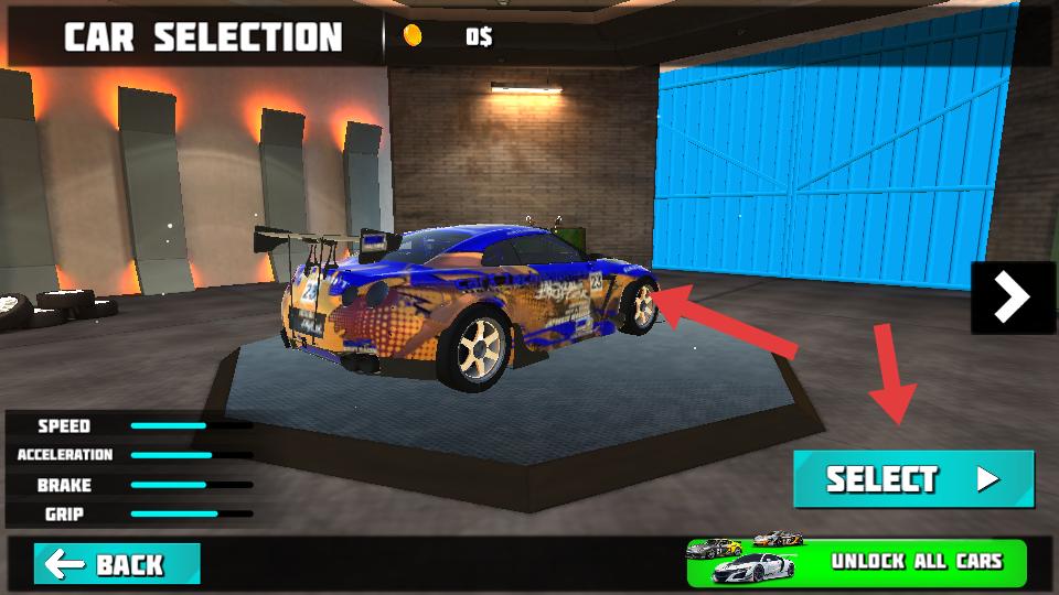 2、在選車界面,能看到不同賽車,查看速度,加速度等屬性,選好賽車后點(diǎn)擊SELECT,確定使用該賽車進(jìn)行比賽。