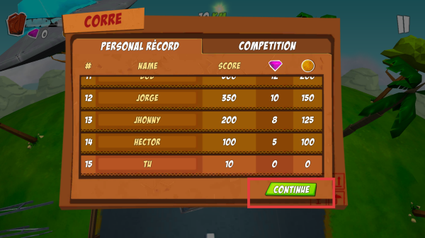 4、當(dāng)一局游戲結(jié)束后,會顯示個人記錄和比賽排名等成績信息,點擊CONTINUE按鈕,可以返回游戲,繼續(xù)開啟新的駕駛挑戰(zhàn)。