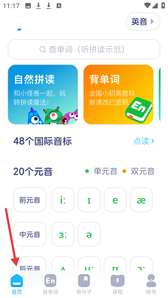 1、首頁(yè)提供自然拼讀、背單詞功能展示48個(gè)國(guó)際音標(biāo),細(xì)分20個(gè)元音,可點(diǎn)讀學(xué)習(xí),助力打好語(yǔ)音基礎(chǔ)。