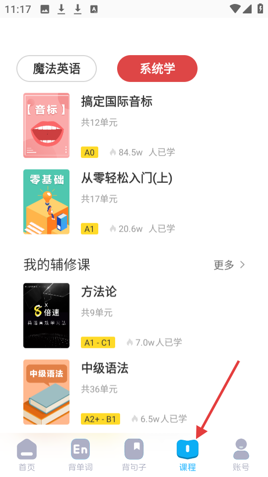 4、課程頁(yè)面分魔法英語(yǔ)與系統(tǒng)學(xué),系統(tǒng)學(xué)包含音標(biāo)、入門課程,還有方法論、中級(jí)語(yǔ)法等輔修課滿足不同學(xué)習(xí)需求。