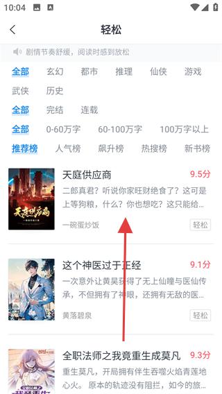 3、在小說推薦頁面選擇感興趣的小說,比如天庭供應(yīng)商,點擊進(jìn)入該小說詳情頁面,查看小說評分、簡介等內(nèi)容。