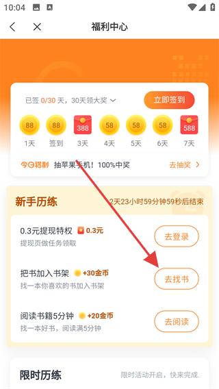 2、在福利中心頁面找到新手歷練板塊,點擊把書加入書架對應(yīng)的去找書按鈕,進(jìn)入小說推薦頁面,瀏覽各類小說。