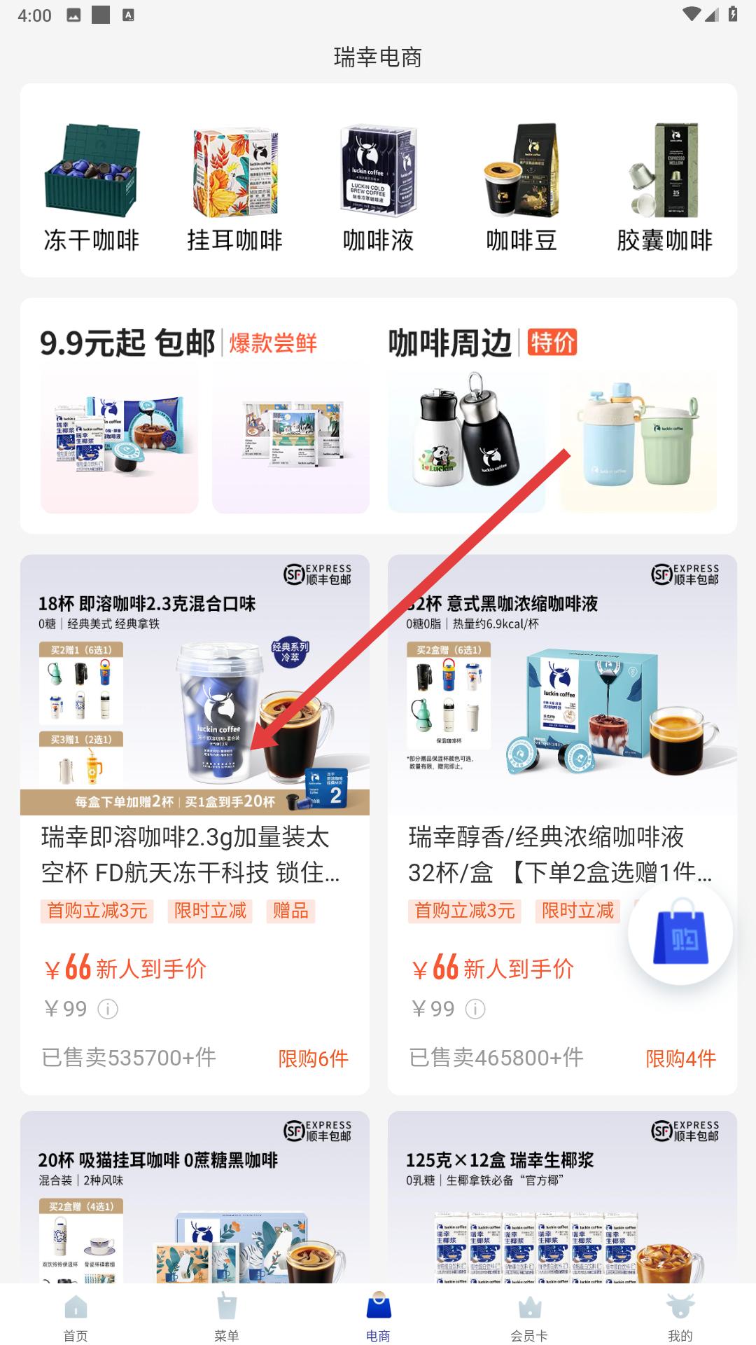 2、電商界面,可看到凍干咖啡、掛耳咖啡等品類(lèi),還有包郵等活動(dòng)專(zhuān)區(qū),選擇心儀商品可進(jìn)入詳情頁(yè)。