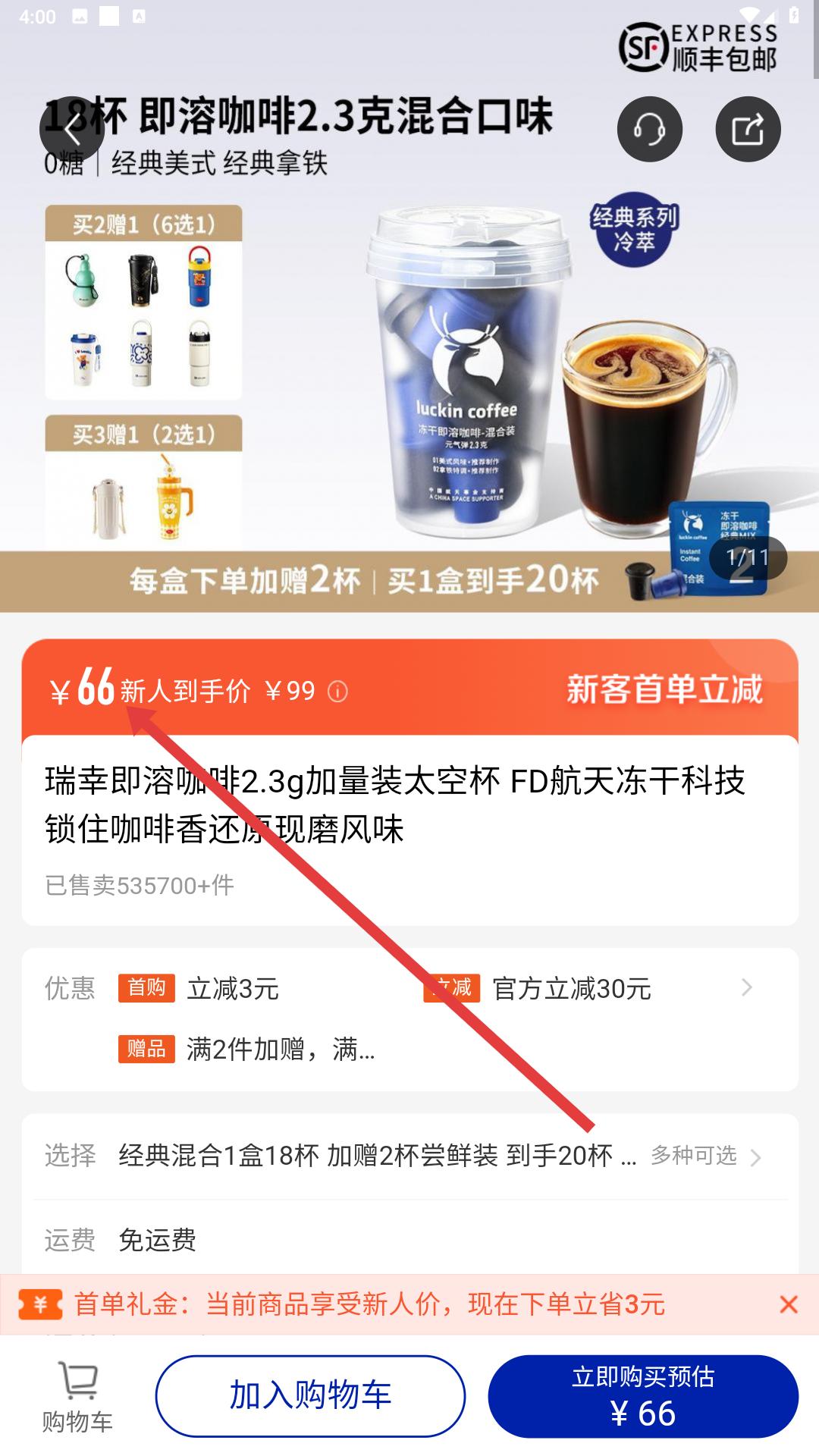 3、進(jìn)入商品詳情頁(yè),可查看商品價(jià)格、優(yōu)惠信息及購(gòu)買(mǎi)選項(xiàng),新人可享受專(zhuān)屬到手價(jià),點(diǎn)擊加入購(gòu)物車(chē)或立即購(gòu)買(mǎi)可完成下單。