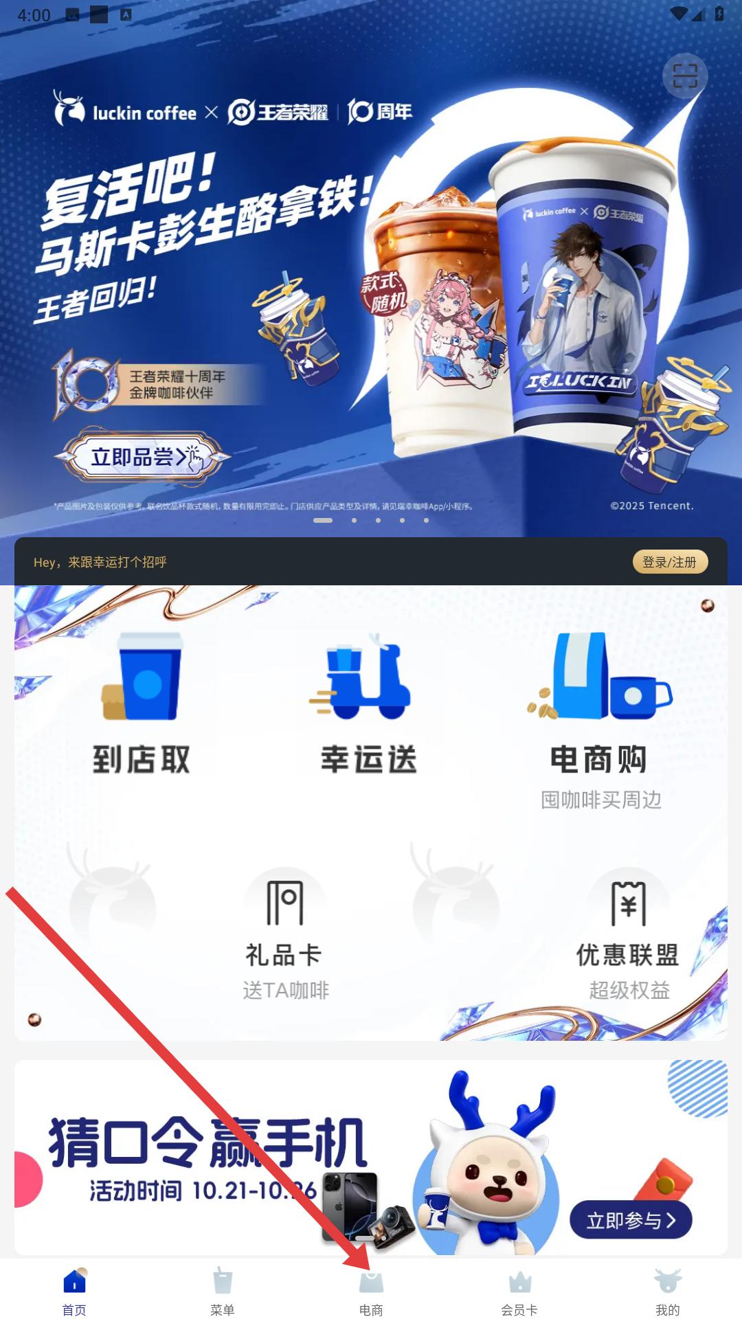 1、進(jìn)入瑞幸咖啡APP首頁(yè),可看到與王者榮耀聯(lián)名活動(dòng)及到店取等功能入口,點(diǎn)擊底部電商可進(jìn)入電商購(gòu)物界面。