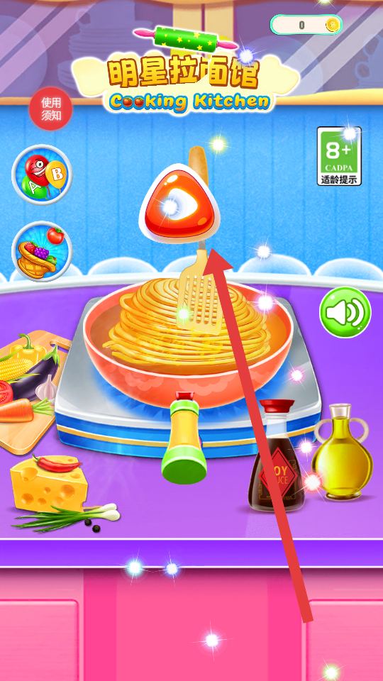 1、進(jìn)入明星拉面館游戲界面,看到鍋中面條和上方食材,按箭頭指引將對(duì)應(yīng)食材添加到面條中開啟美味制作。