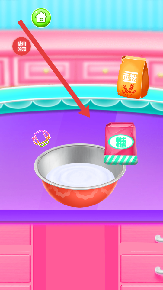 3、隨后到食材準(zhǔn)備步驟,按箭頭提示將指定的糖倒入裝有面粉的碗中為后續(xù)面食制作備料。