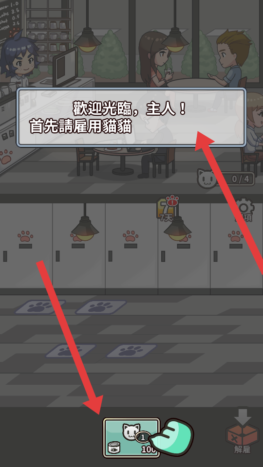 1、進(jìn)入貓咪咖啡館界面看到提示需雇用貓貓,點擊下方帶有貓貓圖案的卡片,消耗對應(yīng)罐頭資源開啟雇用流程。