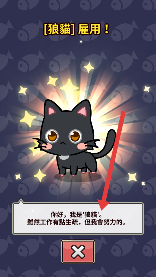 2、完成雇用后彈出新貓貓的介紹,閱讀其文字內(nèi)容,了解貓咪特點,點擊關(guān)閉按鈕確認(rèn)。