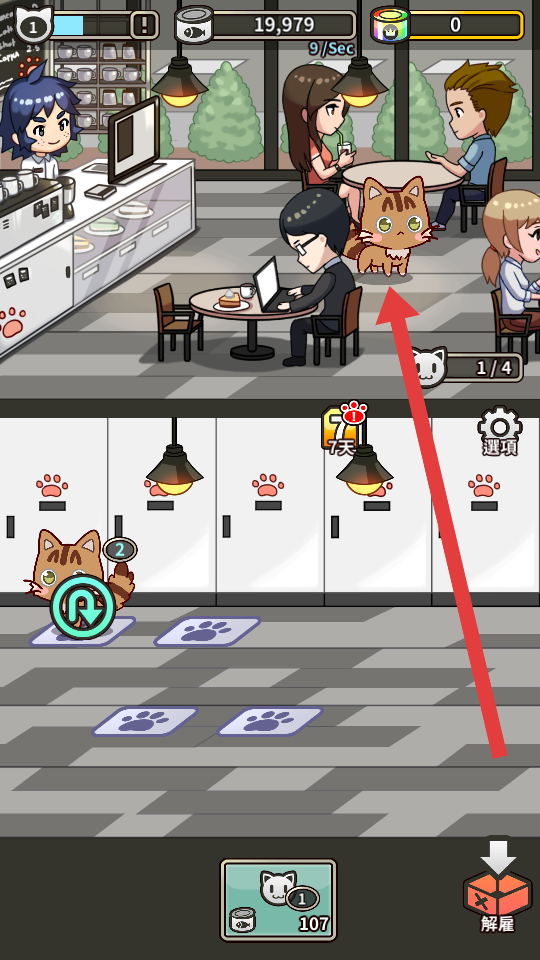 3、回到咖啡館場景雇用的貓貓會出現(xiàn)在店內(nèi),引導(dǎo)貓貓前往指定區(qū)域,讓其開始在咖啡館內(nèi)執(zhí)行工作推進(jìn)經(jīng)營。