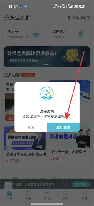 1、打開普通話測試app在軟件注冊成功提示框中點擊立即測試,進入普通話測試題目頁面。