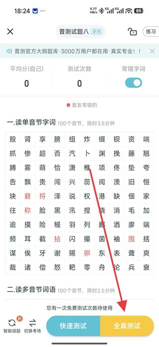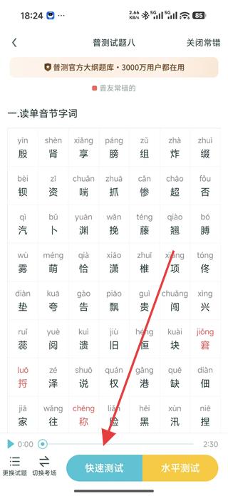 3、在測試準備頁面確認測試內(nèi)容后,點擊快速測試或水平測試,進入讀單音節(jié)字詞的測試界面。