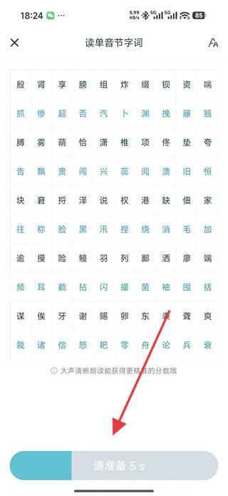 4、在讀單音節(jié)字詞的測試界面,看到請準備5s的提示,等待倒計時結(jié)束后,開始朗讀字詞,進行普通話測試。