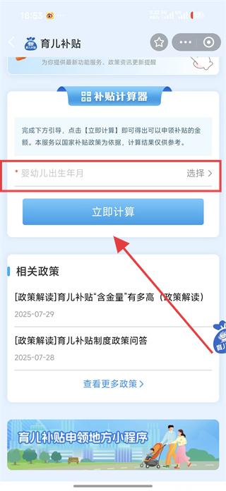 4、若想計(jì)算可申領(lǐng)補(bǔ)貼金額,可找到補(bǔ)貼計(jì)算器板塊,選擇嬰幼兒出生年月,點(diǎn)擊立即計(jì)算按鈕,獲取可申領(lǐng)補(bǔ)貼金額參考結(jié)果。