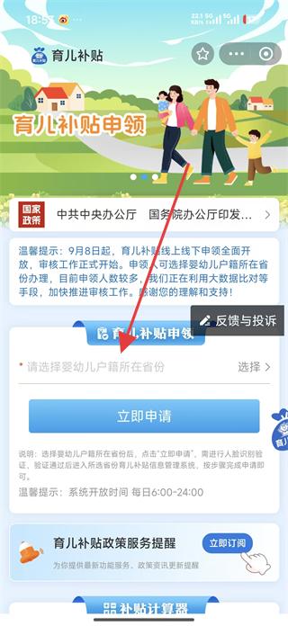 3、在育兒補(bǔ)貼服務(wù)頁(yè)面,點(diǎn)擊育兒補(bǔ)貼申領(lǐng)選項(xiàng),進(jìn)入申領(lǐng)頁(yè)面后,選擇嬰幼兒戶籍所在省份,然后點(diǎn)擊立即申請(qǐng)按鈕。