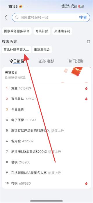 1、在搜索頁(yè)面找到搜索歷史中的育兒補(bǔ)貼申領(lǐng)入口選項(xiàng)并點(diǎn)擊,進(jìn)入育兒補(bǔ)貼相關(guān)服務(wù)頁(yè)面。