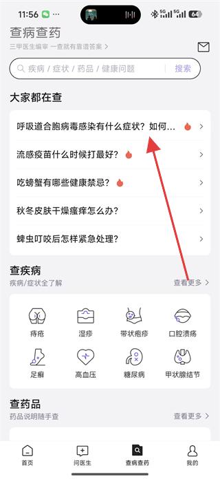 1、進(jìn)入查病查藥板塊,可查看大家都在查的健康問題,如呼吸道合胞病毒感染的癥狀等,點擊感興趣的問題進(jìn)入詳情頁面。