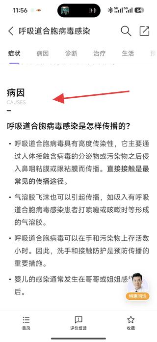 3、查看疾病的病因板塊,如呼吸道合胞病毒感染的傳播途徑等,深入了解疾病的成因,為健康防護(hù)提供依據(jù)。
