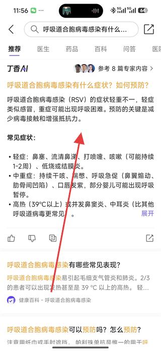 2、在健康問題詳情頁面,可查看丁香AI整理的內(nèi)容,如呼吸道合胞病毒感染的癥狀、預(yù)防方法等,了解疾病的基本信息。