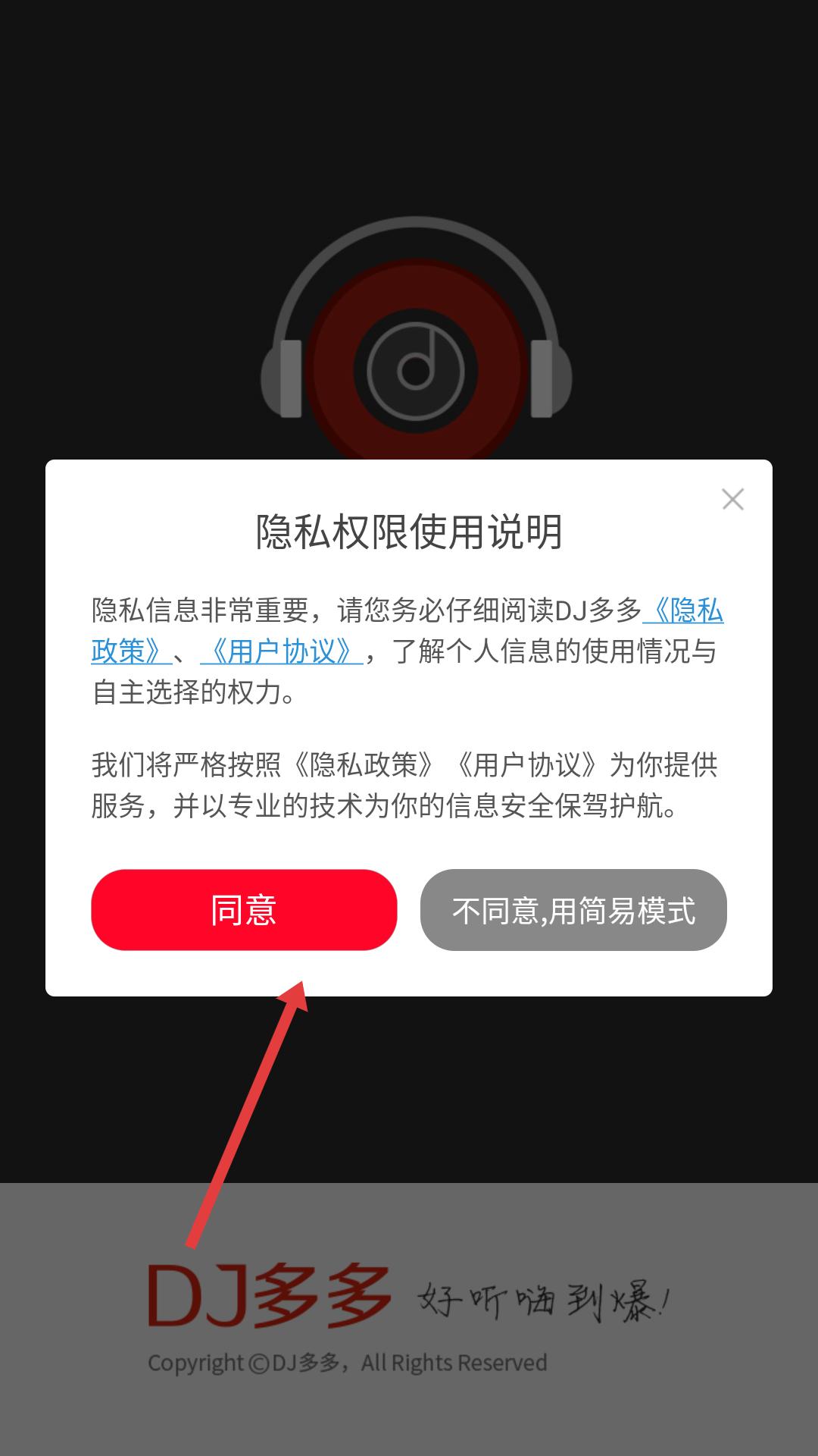 1、打開軟件,在隱私權限頁點擊同意,進入熱歌界面,挑選感興趣歌單,開啟音樂播放。