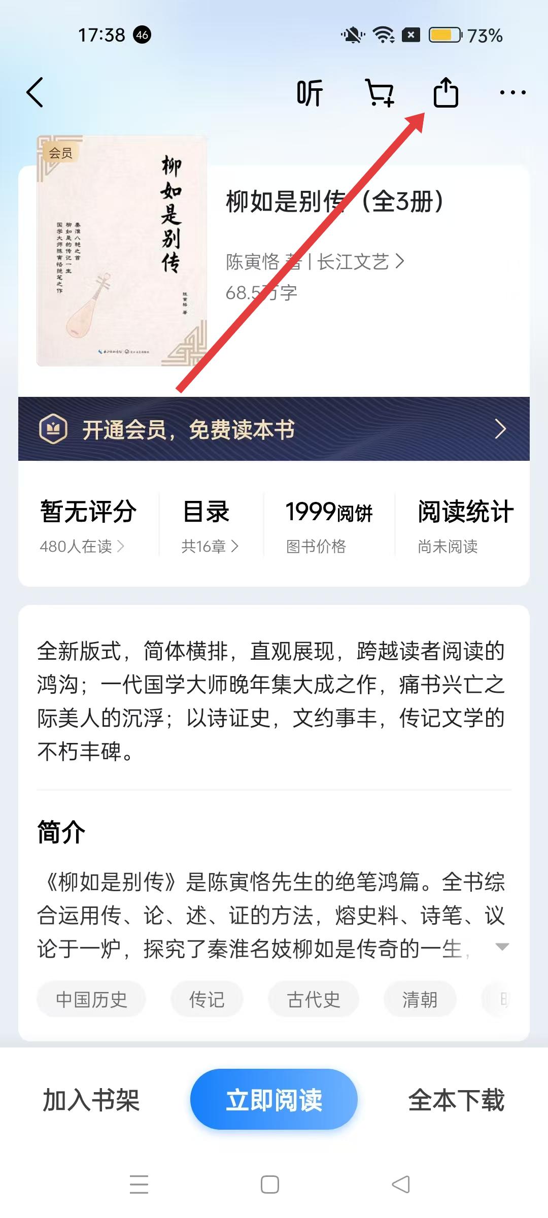 2、點(diǎn)擊書籍柳如是別傳進(jìn)入詳情界面,可查看書籍作者、字?jǐn)?shù)、簡(jiǎn)介等信息,還有聽書、分享、購(gòu)買等功能選項(xiàng),可點(diǎn)擊立即閱讀開始閱讀。