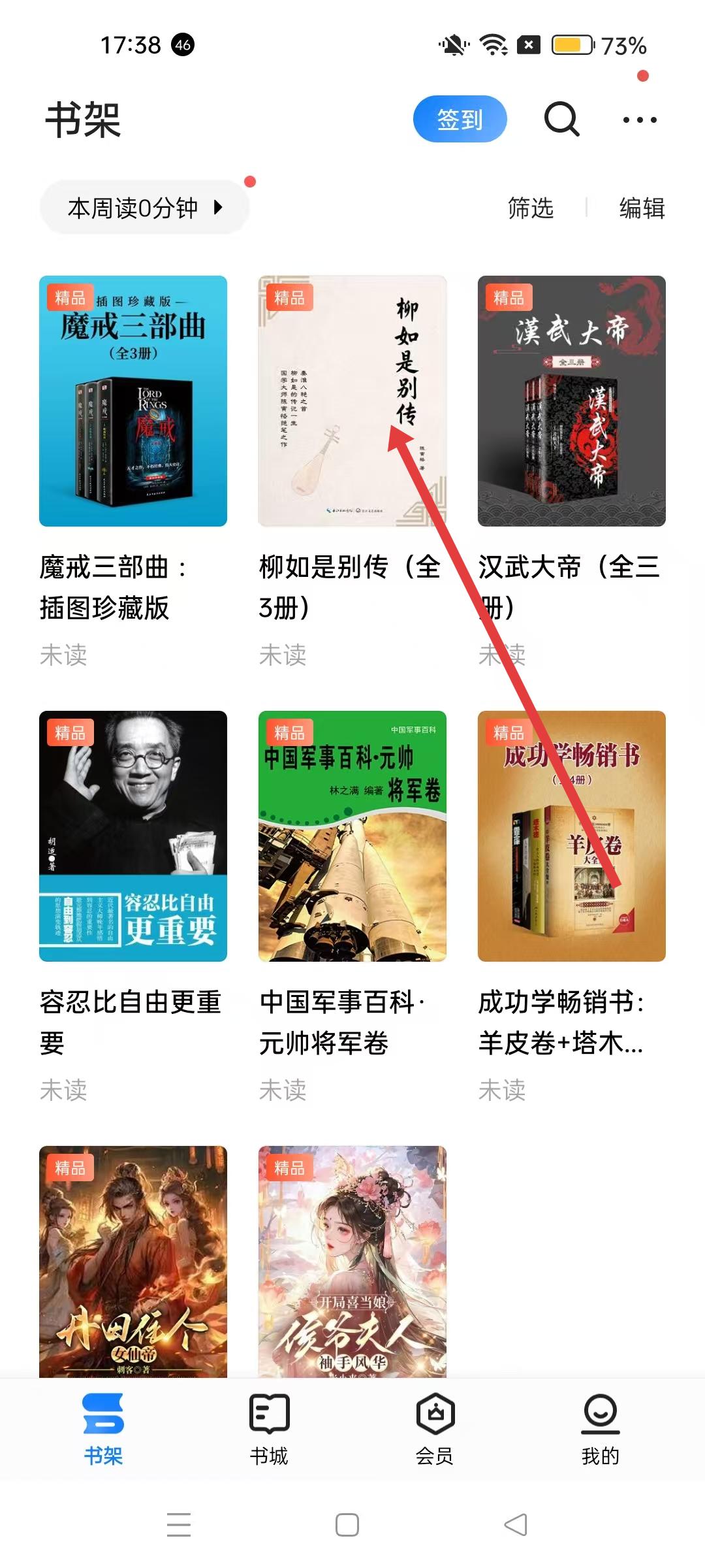 1、進(jìn)入讀書APP書架界面,可看到收藏的書籍列表,如魔戒三部曲插圖珍藏版、柳如是別傳等,頂部有簽到、搜索功能,底部有書架、書城、會(huì)員、我的等入口。