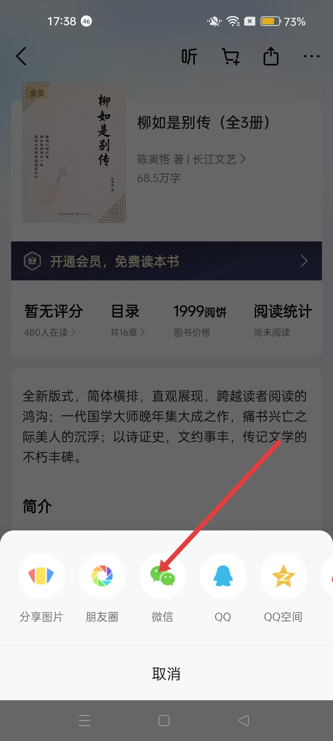 3、點(diǎn)擊分享功能后,可選擇分享到微信、QQ、朋友圈等多個(gè)平臺(tái),方便向他人推薦書籍。