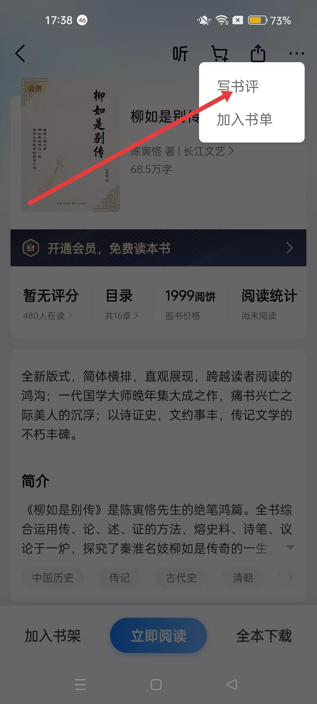 4、書籍詳情界面還可選擇寫書評(píng)功能,分享對(duì)書籍的閱讀感受和評(píng)價(jià),也可將書籍加入書單,方便管理和查找。
