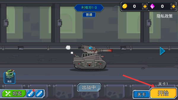 1、進(jìn)入游戲,選擇坦克后點(diǎn)擊開(kāi)始,進(jìn)入關(guān)卡操控坦克場(chǎng)景中移動(dòng),準(zhǔn)備與敵人坦克展開(kāi)戰(zhàn)斗。