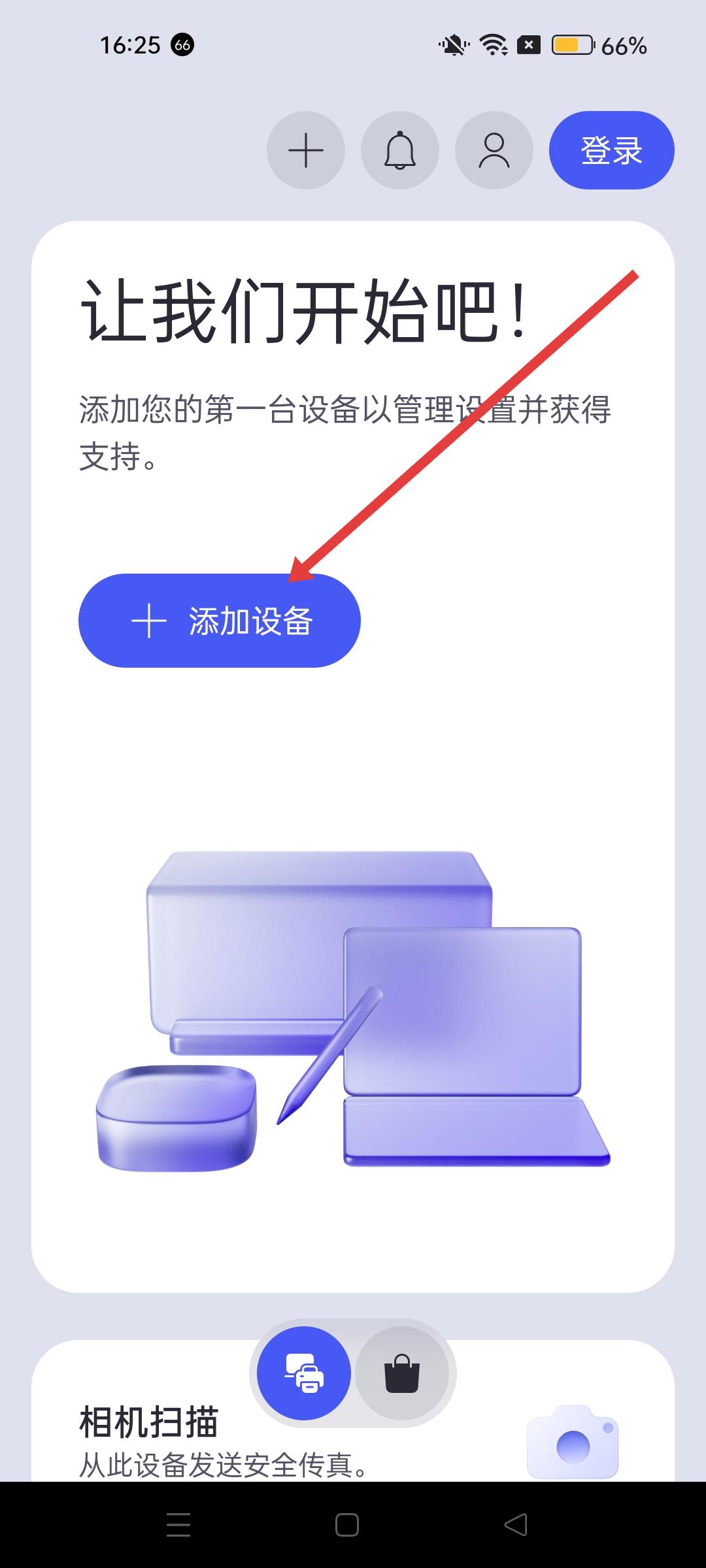 1、打開(kāi)應(yīng)用后,在主界面找到添加設(shè)備按鈕,點(diǎn)擊它進(jìn)入設(shè)備添加界面,開(kāi)啟打印機(jī)添加流程。