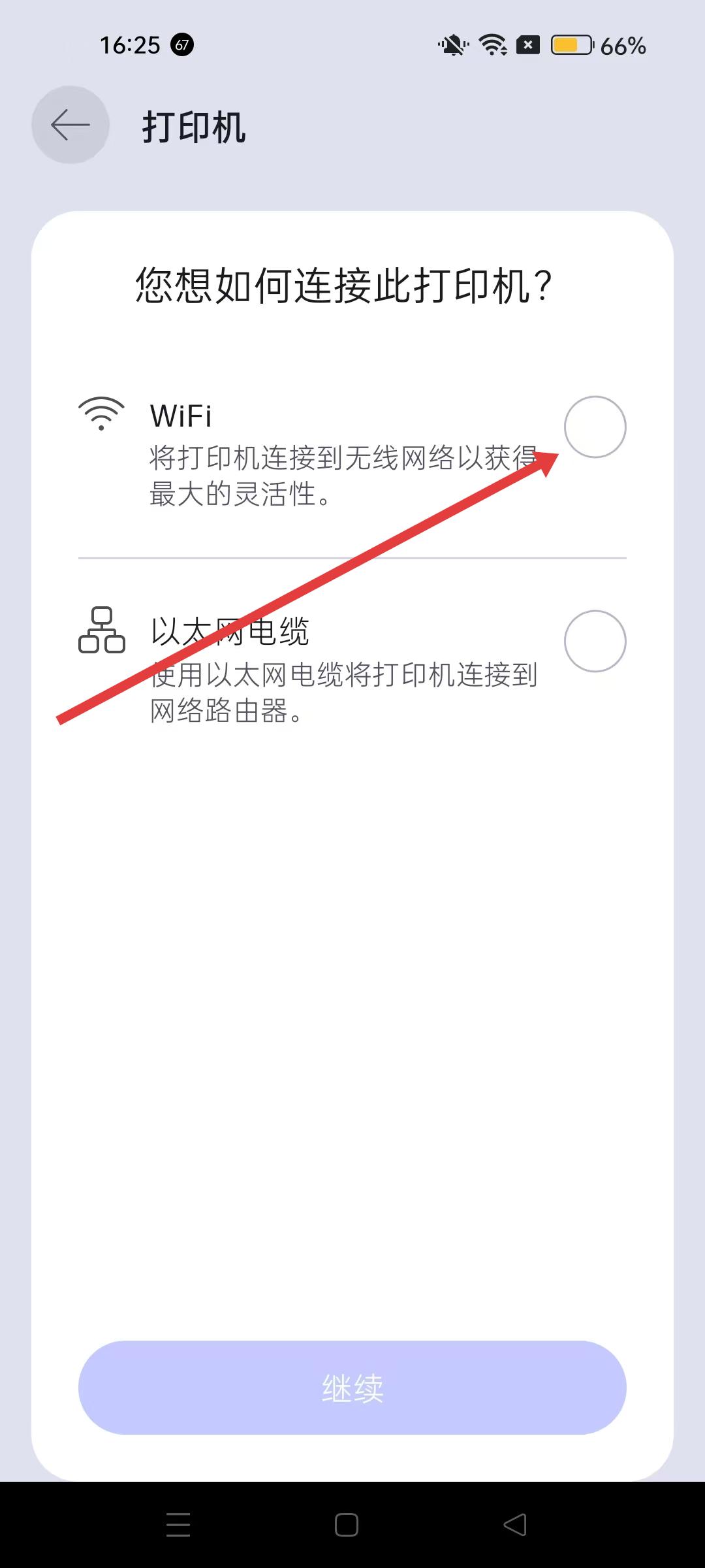 3、打印機(jī)連接方式選擇頁(yè)面,選擇WiFi連接方式,進(jìn)入WiFi連接準(zhǔn)備頁(yè)面。