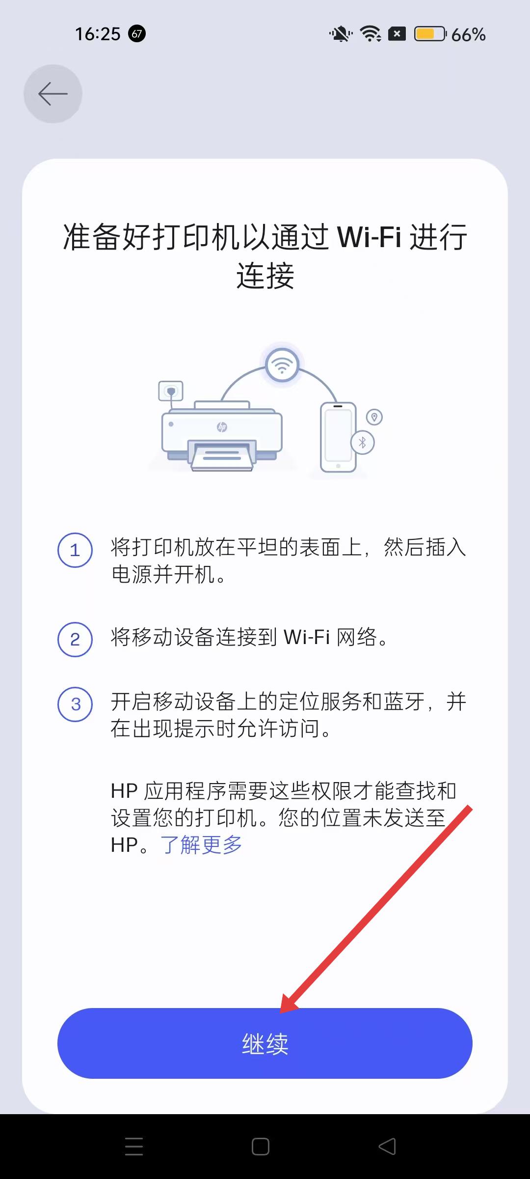 4、WiFi連接準(zhǔn)備頁(yè)面,按照提示準(zhǔn)備好打印機(jī)和移動(dòng)設(shè)備,然后點(diǎn)擊繼續(xù)按鈕,按照后續(xù)提示完成打印機(jī)的WiFi連接設(shè)置,完成打印機(jī)添加操作。