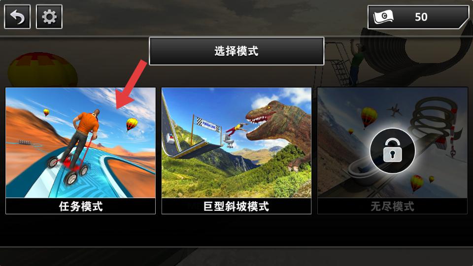 2、在模式選擇界面,有任務(wù)模式,巨型斜坡模式等可選,選擇任務(wù)模式,進(jìn)入任務(wù)相關(guān)的特技駕駛場景。