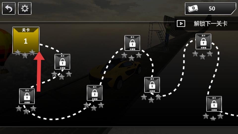 3、在關(guān)卡選擇界面,可選擇關(guān)卡1,進(jìn)入該關(guān)卡的特技駕駛場景,準(zhǔn)備駕駛車輛進(jìn)行特技挑戰(zhàn)。