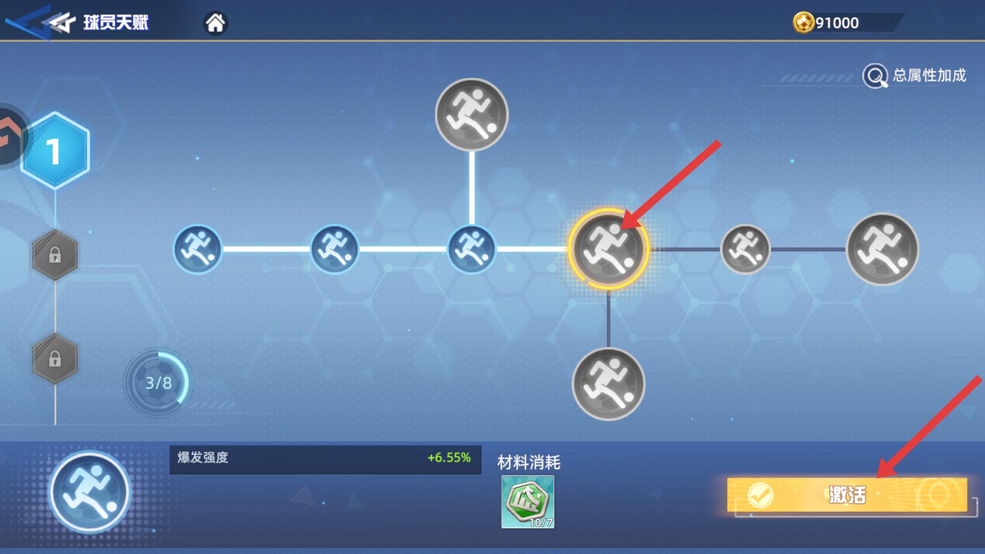 4、在球員天賦界面,選擇想要激活的天賦節(jié)點,確認材料消耗滿足要求后,點擊右下角激活按鈕,可提升球員對應(yīng)屬性。