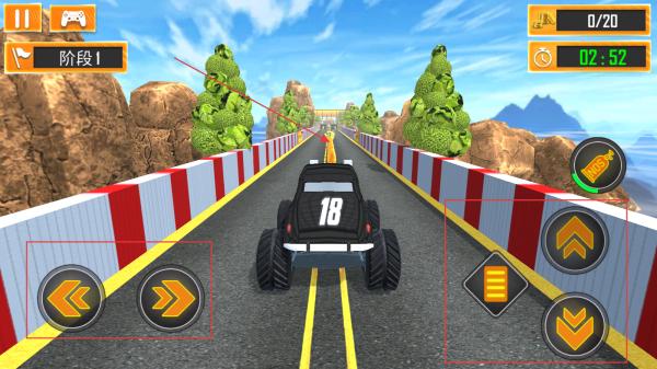 3、通過屏幕左下角的按鈕控制怪物卡車的轉(zhuǎn)向,右下角的按鈕進(jìn)行加速、減速操作,道路上會(huì)有金幣和道具玩家可進(jìn)行收集。
