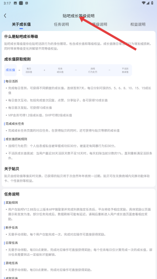 4、查看貼吧成長(zhǎng)說(shuō)明,了解成長(zhǎng)值獲取規(guī)則、成長(zhǎng)值獲取途徑等內(nèi)容,助力提升貼吧等級(jí)。