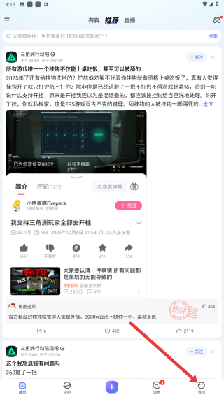 1、貼吧推薦界面,瀏覽各類帖子后,點(diǎn)擊底部我的,進(jìn)入個(gè)人相關(guān)頁(yè)面。