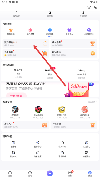 2、個(gè)人頁(yè)面,能看到常用功能、成長(zhǎng)任務(wù)等板塊,點(diǎn)擊我的等級(jí),可查看等級(jí)相關(guān)信息。