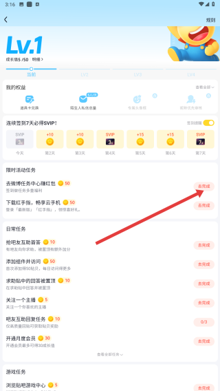 3、進(jìn)入等級(jí)頁(yè)面,能看到當(dāng)前等級(jí),還有日常任務(wù)、限時(shí)活動(dòng)任務(wù)等,可點(diǎn)擊去完成參與任務(wù)。